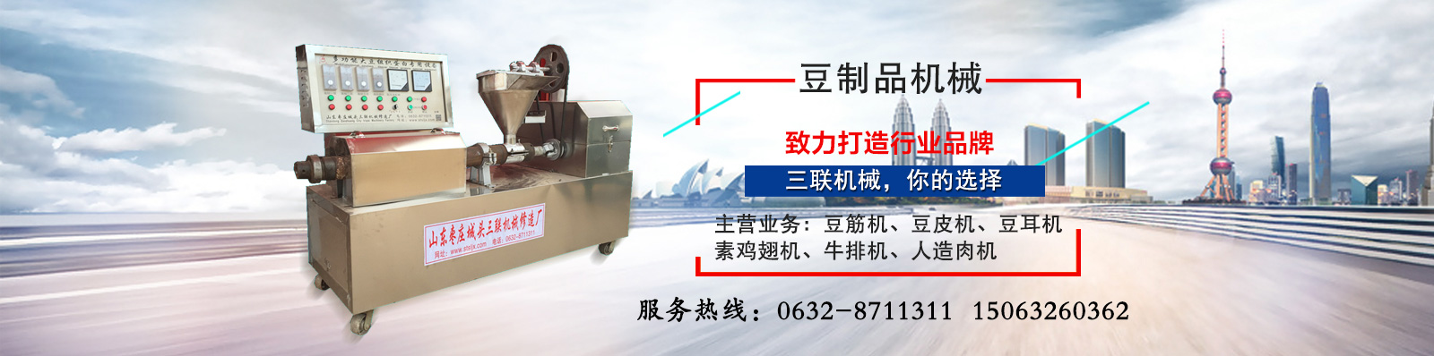 山亭區城頭三聯機械修造廠成立于1994年,位于鐵道游擊隊故鄉山東省棗莊市山亭區工業園,本地區交通十分便利,京福高速公路、京滬鐵路、104國道由此貫穿,是全國生產豆制品,規模較大的生產基地。山亭區城頭三聯機械修造廠經過不斷的努力和研發終于有所突破,本廠的產品得到廣大消費者的信任和擁護,主營豆制品機械和麻辣面食機械:素牛排機、素雞腸機、素雞脯肉機、豆蝦機、豆魚機..